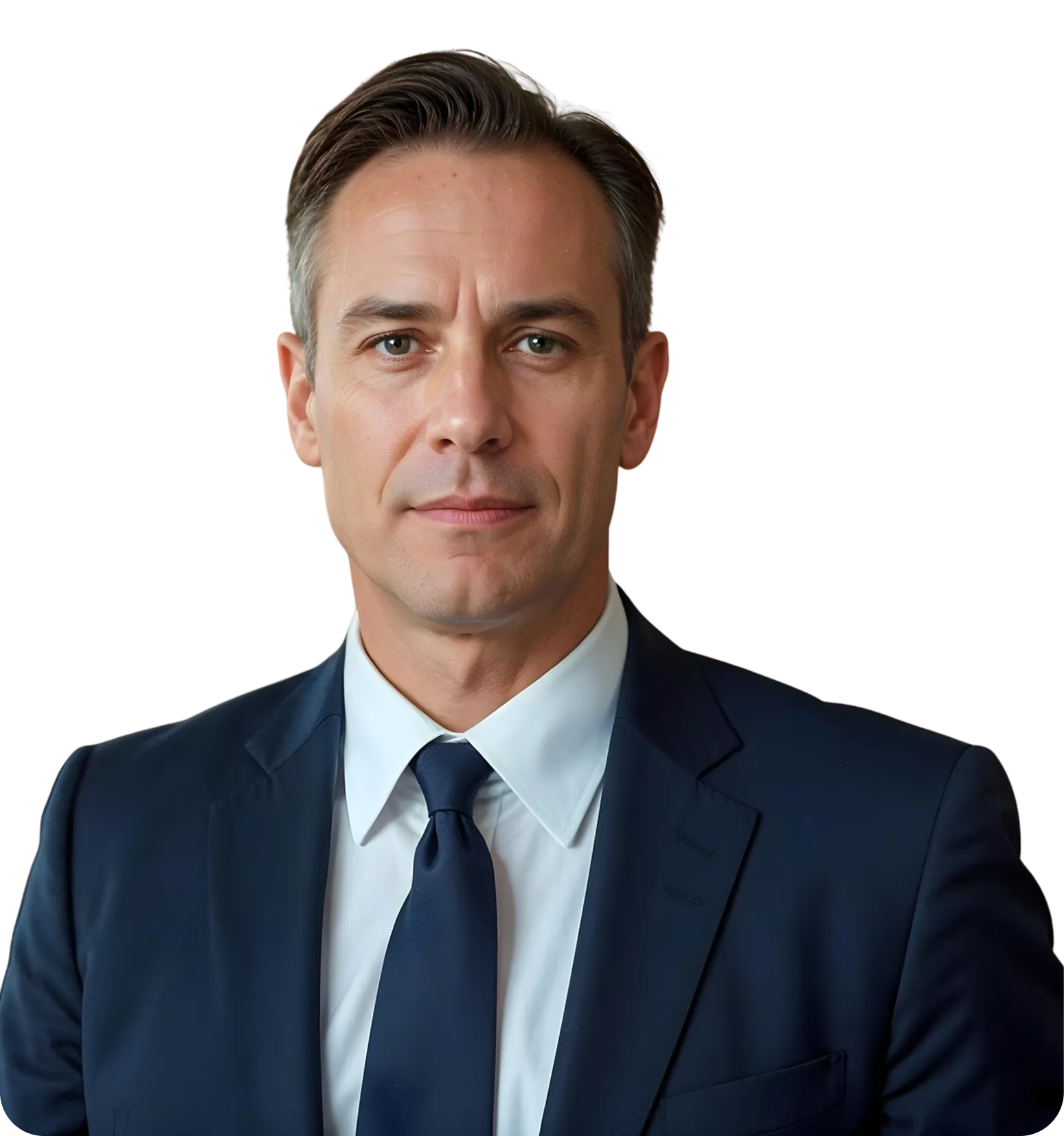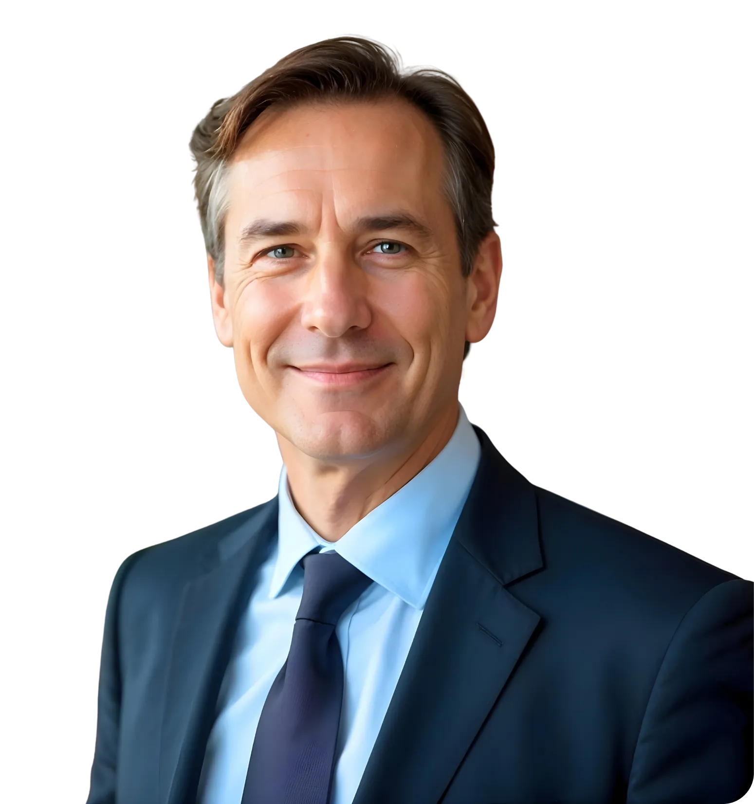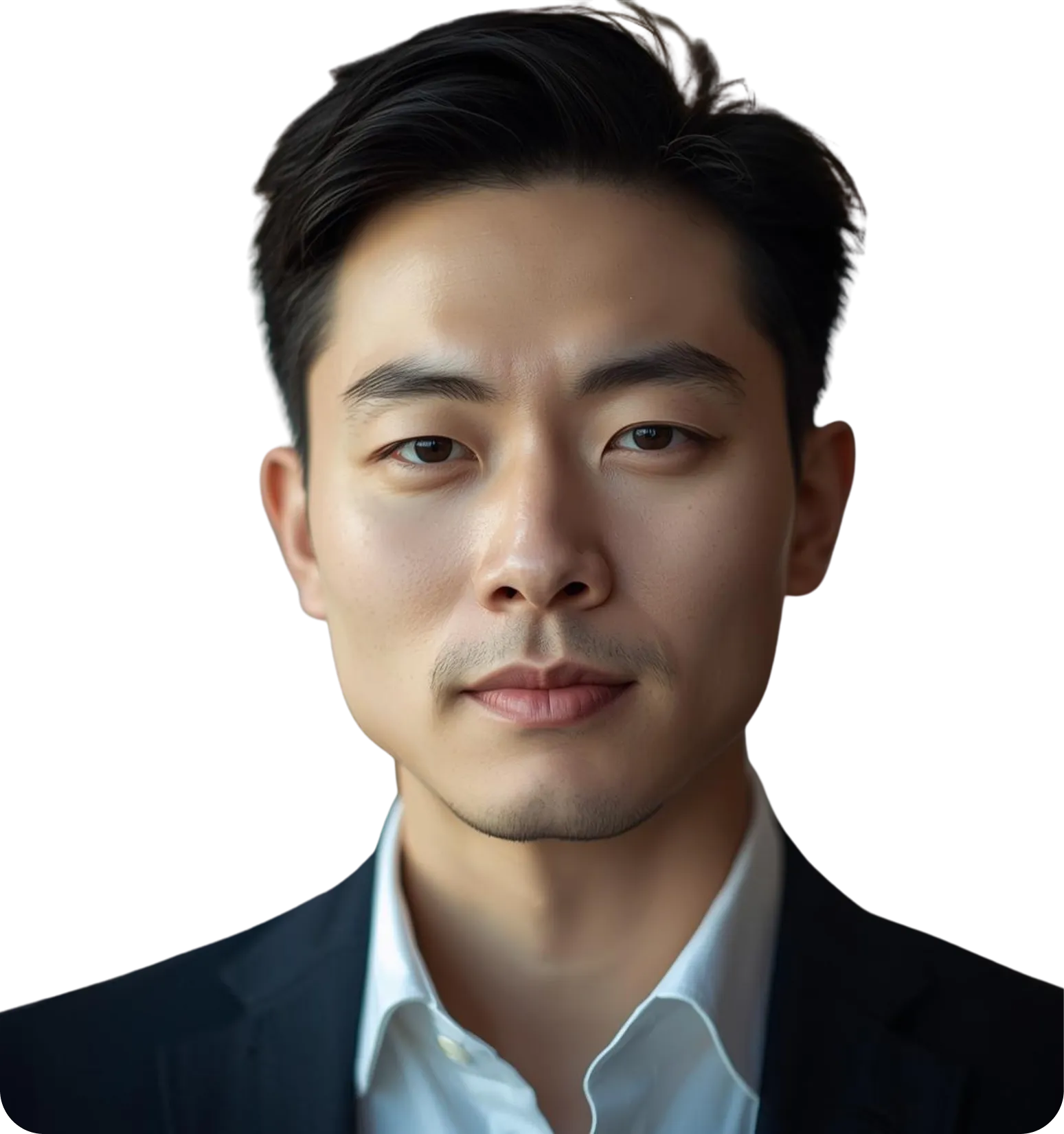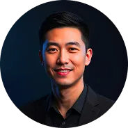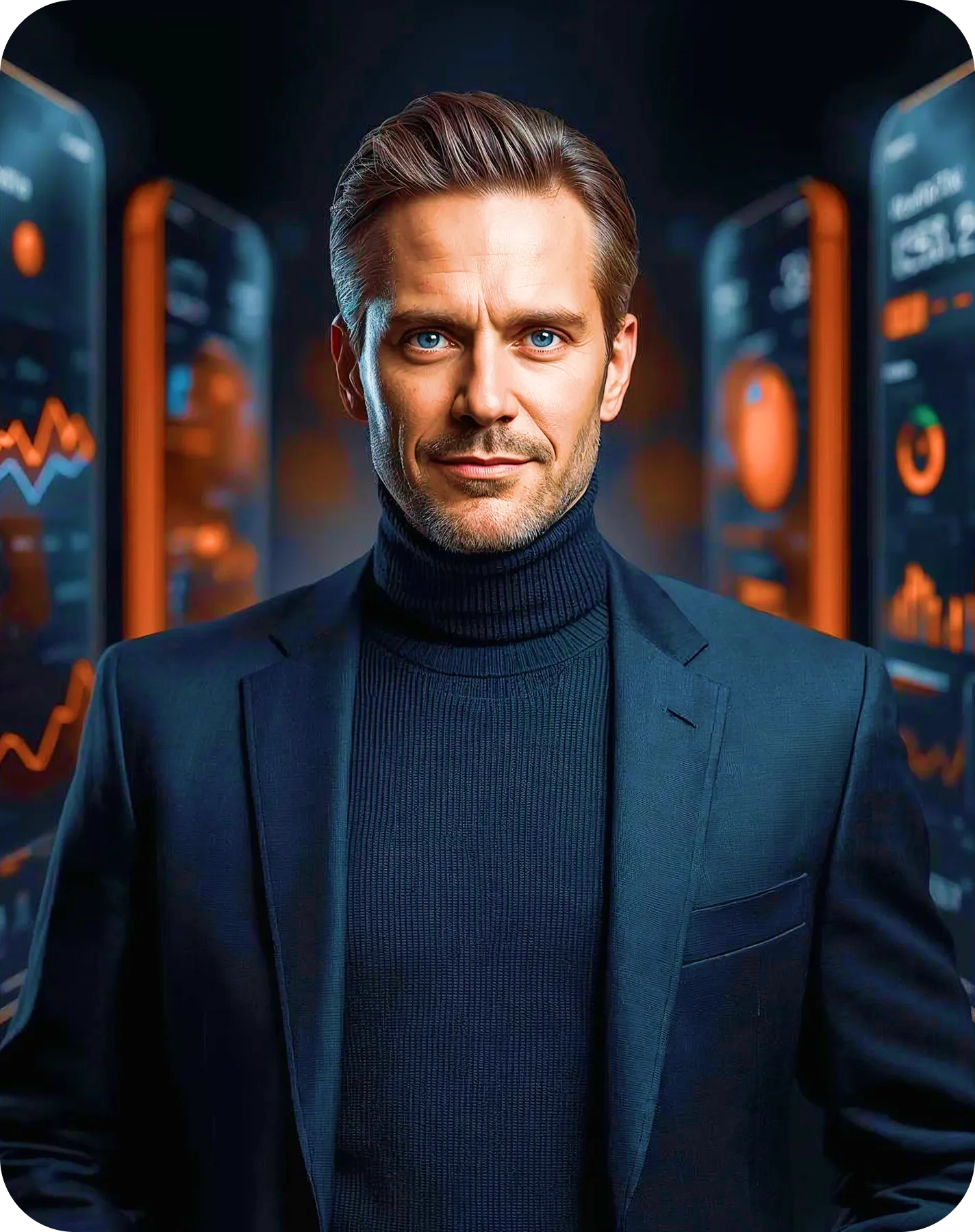 Smiling man in a black turtleneck and blazer standing between two glowing orange digital interfaces with graphs and data.