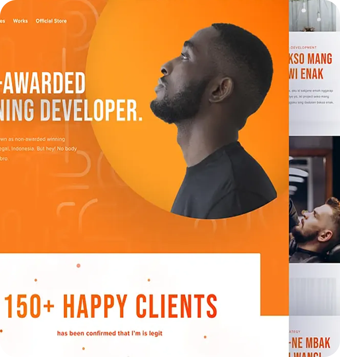Black background with white and orange text displaying contact email, phone, freelance availability, introduction as a creative digital designer based in California, plus 1500+ hours of work and 550K+ lines of code.
